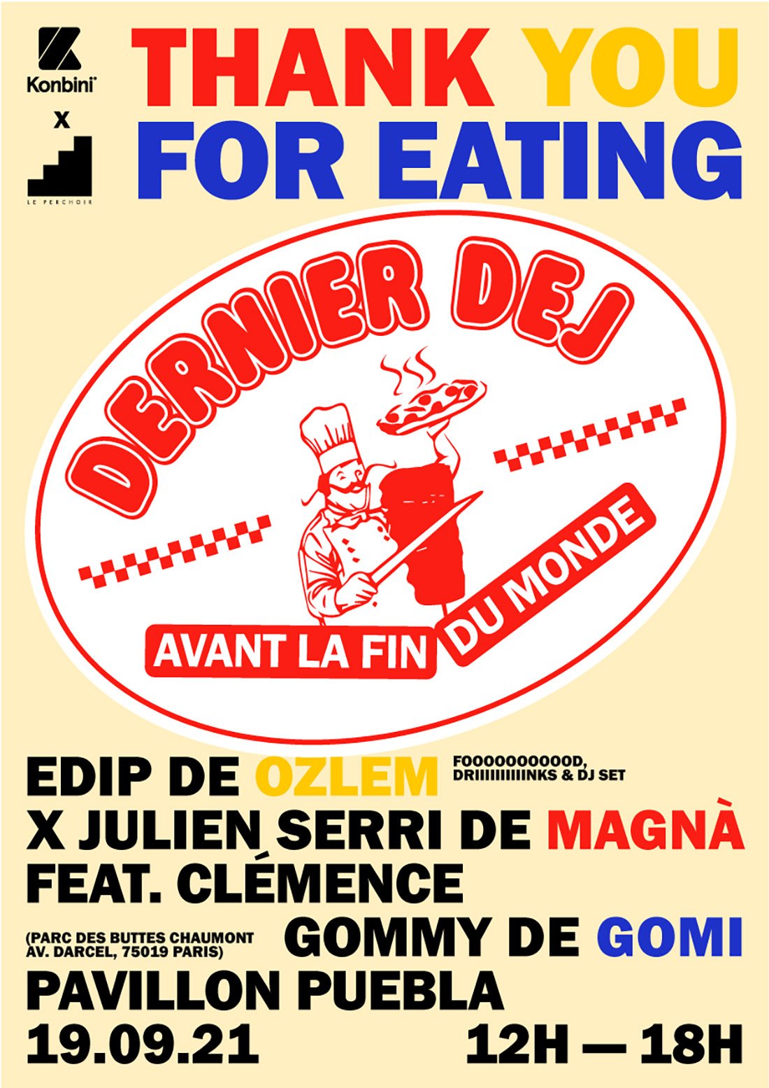 Ceci est un message de service. Le dimanche 19 septembre, Konbini Food et Le Perchoir vous convient au Pavillon Puebla pour un déjeuner voué à s’éterniser. Trois services, de midi à 18h, avec au menu une collab’ entre Özlem et Magnà pour une hybride pizza-kebab tout droit sortie d’un rêve adolescent. Et vu qu’on n’a pas vraiment réfléchi aux apports caloriques, c’est la brillante Clémence Gommy de Gomi qui se chargera du dessert avec trois variations de son délicieux cheesecake basque, en version nature, chocolat ou fleur d’oranger.
