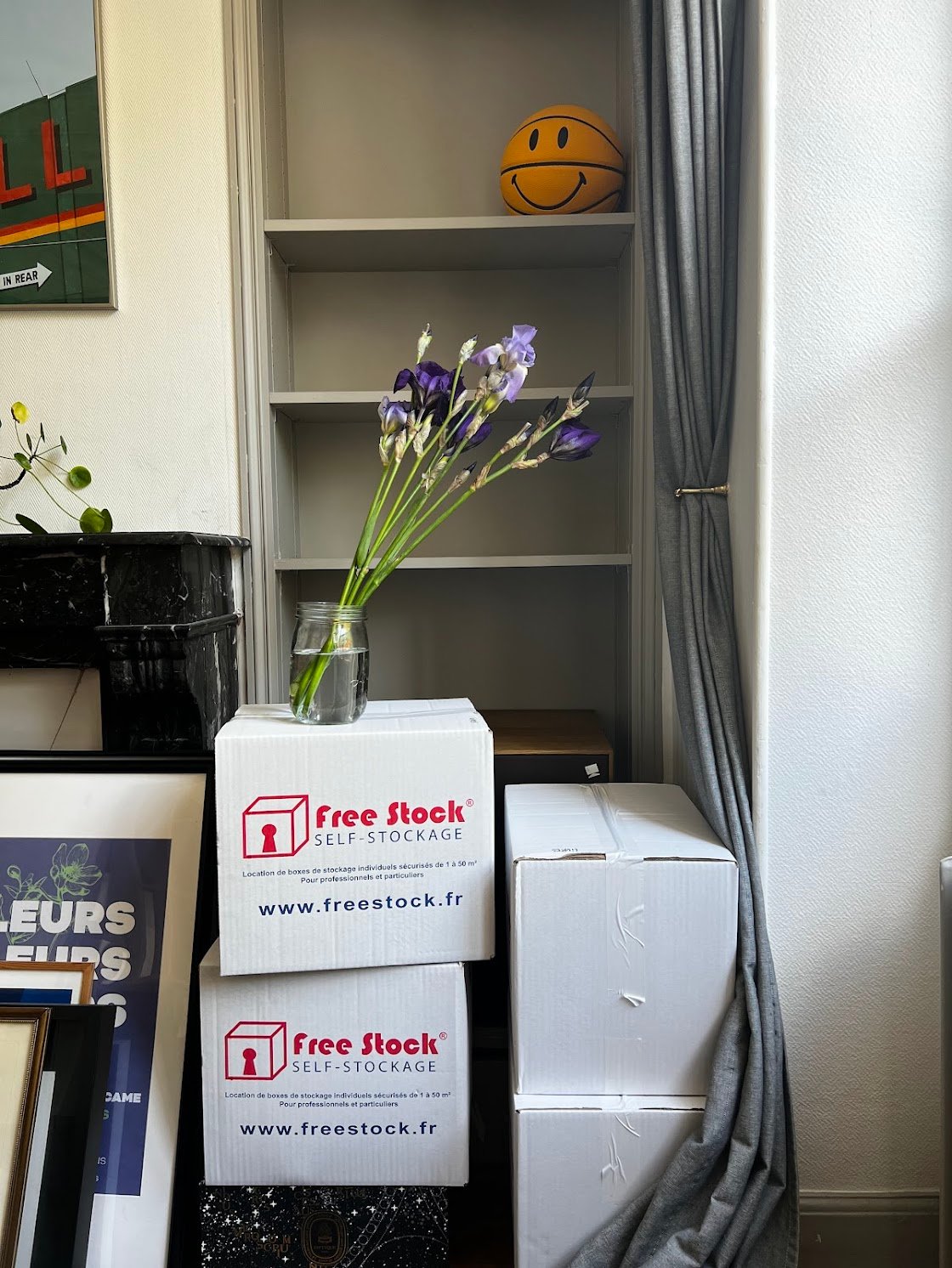 Bien sûr, de retour à la maison, les vases étaient déjà emballés, roulés dans du papier bulle et agencés bien serrés dans un carton scotché avec les mots vases-fragile-salon au feutre noir sur le dessus. Alors j’ai glissé mes iris dans un bocal, comme si j’offrais un bouquet adolescent, avant de les poser sur une pile de cartons de livres.